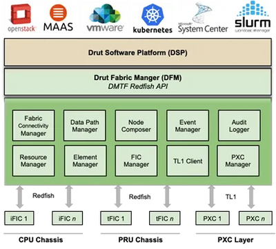 The Drut Fabric Manager (DFM) serves as the operational control center for the photonic fabric, managing a dynamic pool of resources—including CPUs, GPUs, memory, storage, and IPUs. DFM enables the creation of machines from this resource pool and programs the photonic switch (PXC) to configure these machines as needed. This unique capability ensures seamless dynamic fabric operations. By leveraging data from Fabric Interface Cards, DFM facilitates real-time programming and reprogramming of the PXC for optimal outcomes. It also supports end-to-end orchestration with run-time attach/detach of system devices without disrupting the BIOS or operating system.